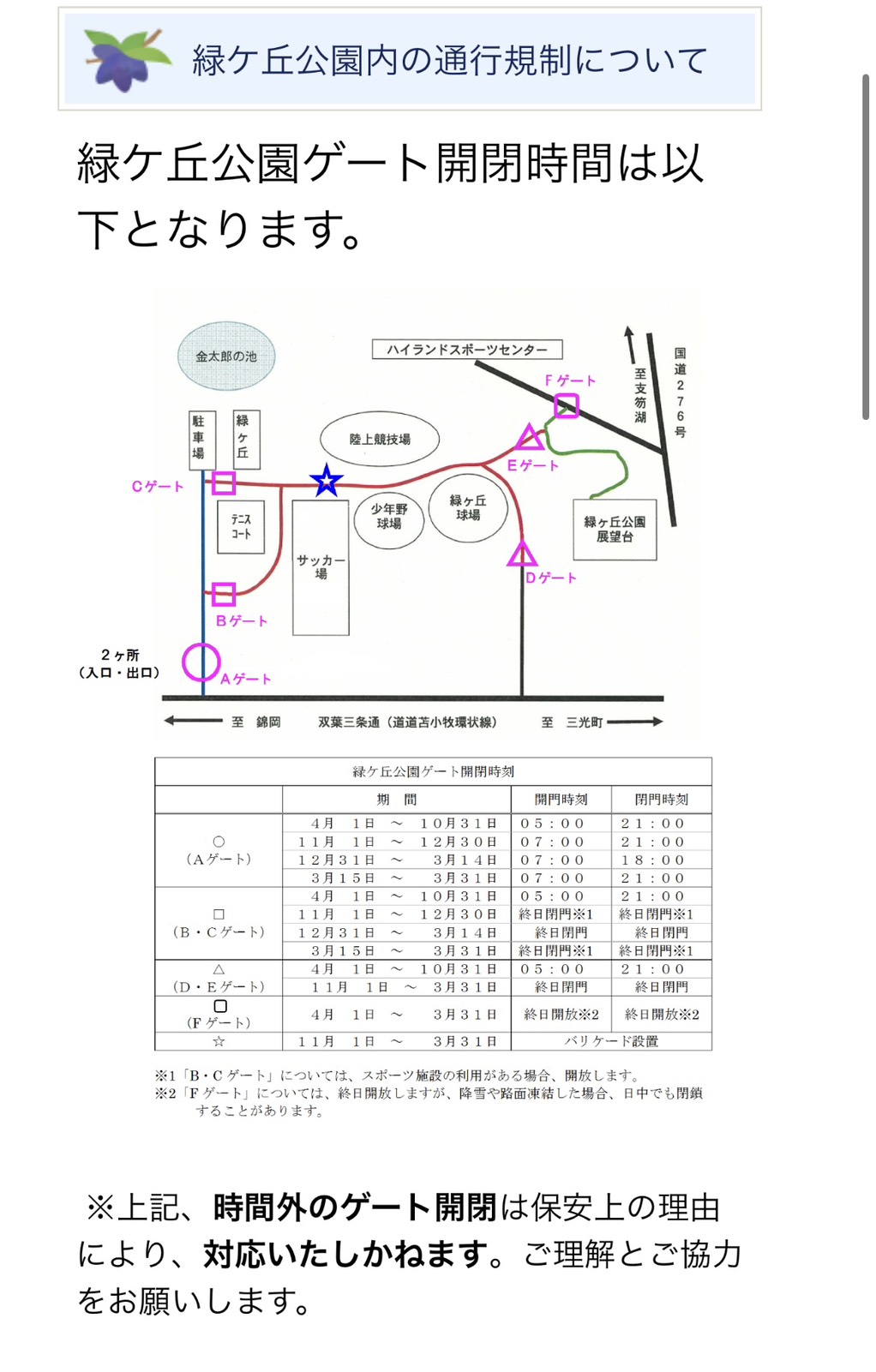 11/1から緑ケ丘公園ゲート開閉時間が変わります。ご確認の上、ご利用ください。