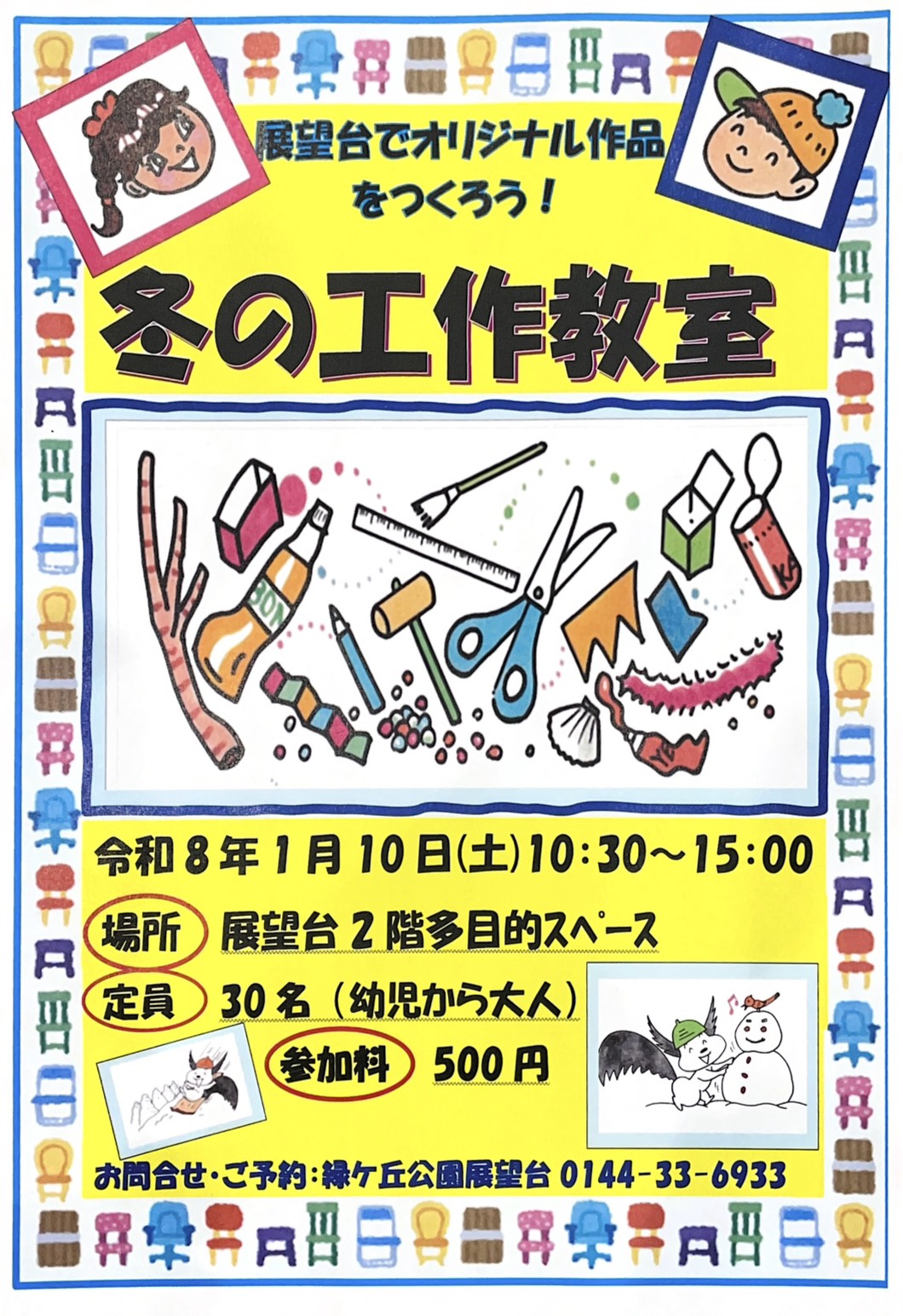 工作教室を開催します✂️ 日時🔷令和8年1月10日(土)10:30〜15:00 場所🔷展望台2階多目的スペース 身近な材料をたくさん用意しています🌳 興味のある方のご参加をお待ちしてます♬ ただいま、予約を受け付けております✨️ ☎0144-33-6933