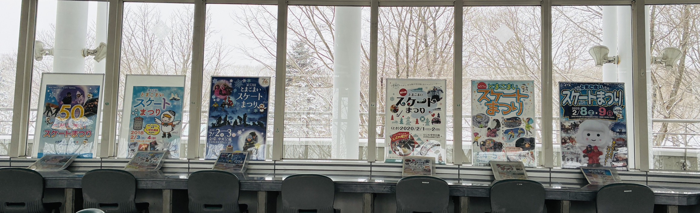 スケートまつり開催(2/7•2/8)にあわせて展望台では2/8まで 3階展望室と2階多目的スペースにて歴代ポスターと当時のプログラムを添えて展示しております。