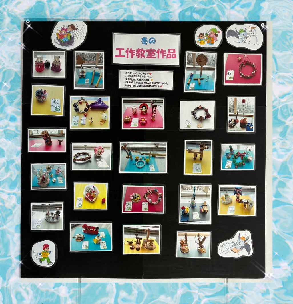 3階展望室エレベーター前の壁に1月10日に開催しました『工作教室』で制作した参加者(幼児~小学生) の作品をボードにまとめて貼り展示してます📸✨️